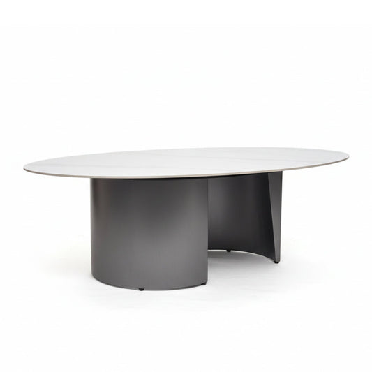 OVALARC Oval Ceramic Coffee Table – White Marble Porcelain & Brushed Grey Steel